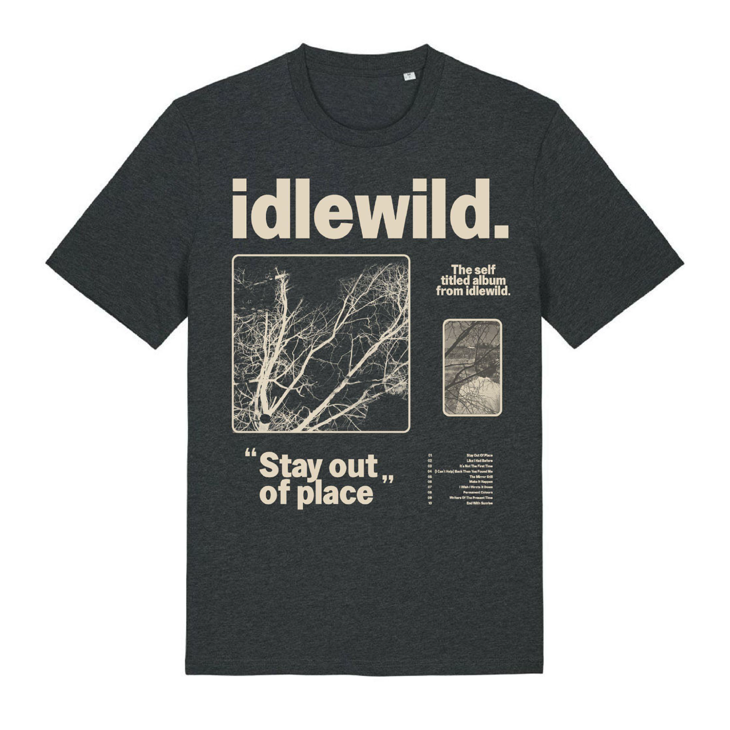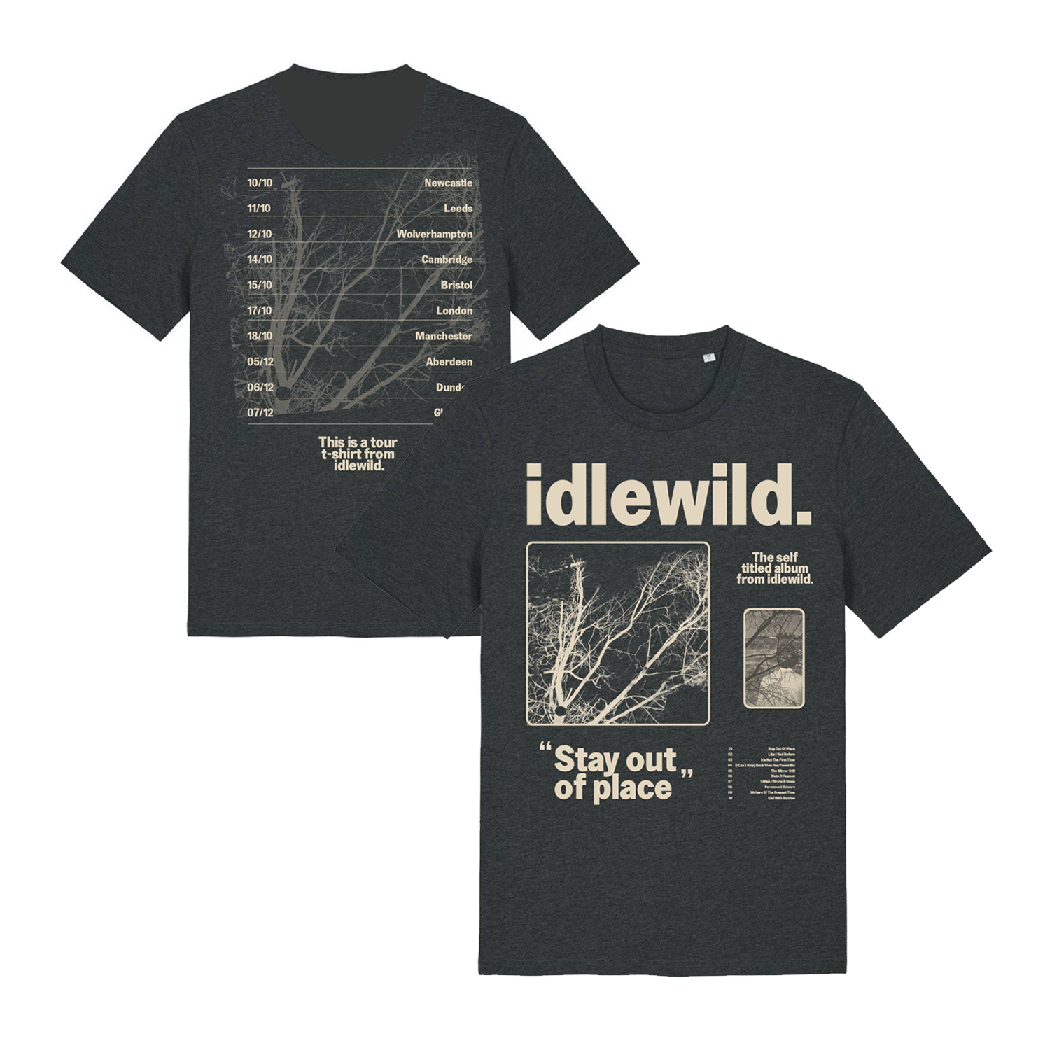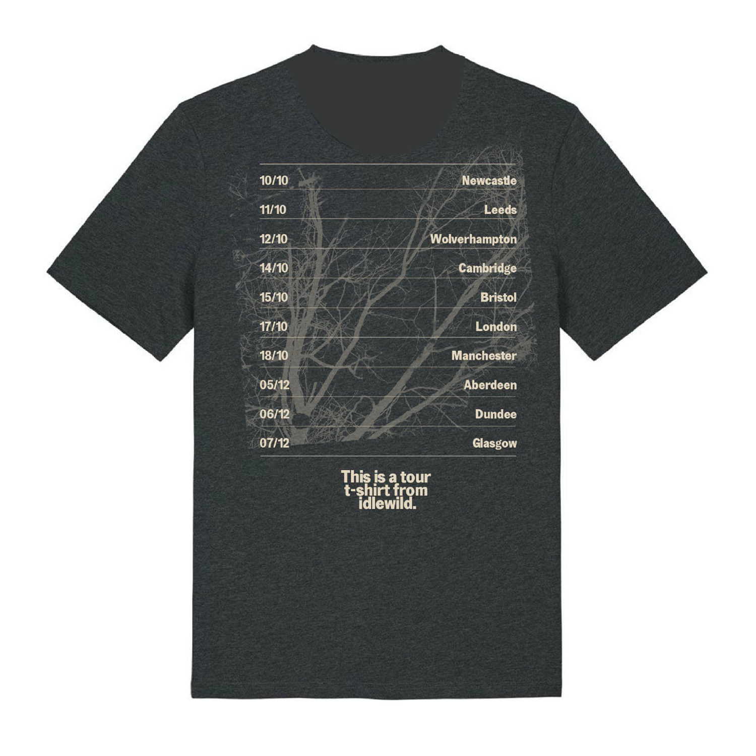 Heather grey Gildan Softstyle t-shirt with 'Idlewild' front print, and 2025 headline tour dates on the back.